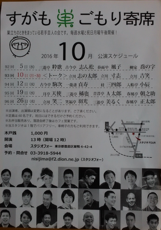 スタジオフォーはとげぬき地蔵商店街の近くの小さなビルの一階にある。二つ目の会だからそんなに入らないだろうな、と思って商店街を散歩してきた。お年寄りの原宿と言われるだけあって歩いている人の平均年令は高い。原宿の三倍くらいではないだろうか。