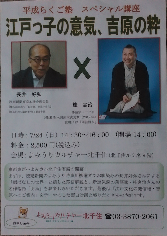 よみうりカルチャー特別企画「江戸っ子の意気、吉原の粋」という題名の会へ行った。読売新聞編集委員長井好弘先生の解説と噺家桂宮治の落語、最後に二人の対談と盛りだくさんの会だった。長井先生はやたら落語とその周辺の知識に詳しい。今日は長井先生による吉原の歴史的、地理的、人文的解説から始まった。予定では30分だったが10分延長の後、宮治に引き継いだ。