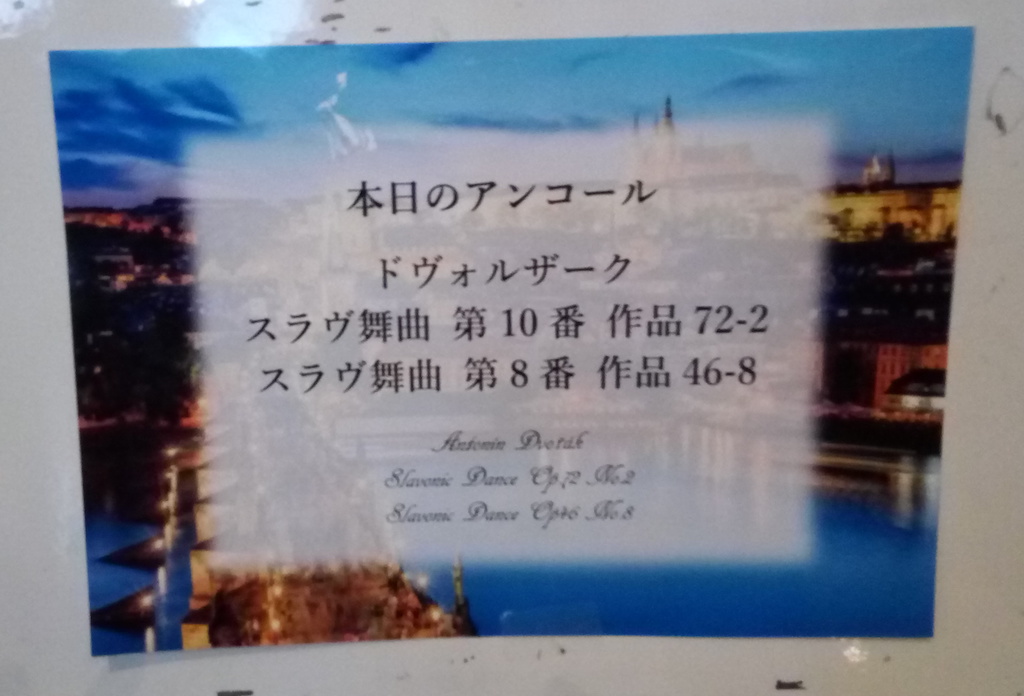 アンコールの2曲、スラヴ舞曲の10番と8番はそれぞれ親しみのある曲でよかった。10番はしんみりと8番は華やかにそれぞれ特徴がはっきりしていて楽しかった。