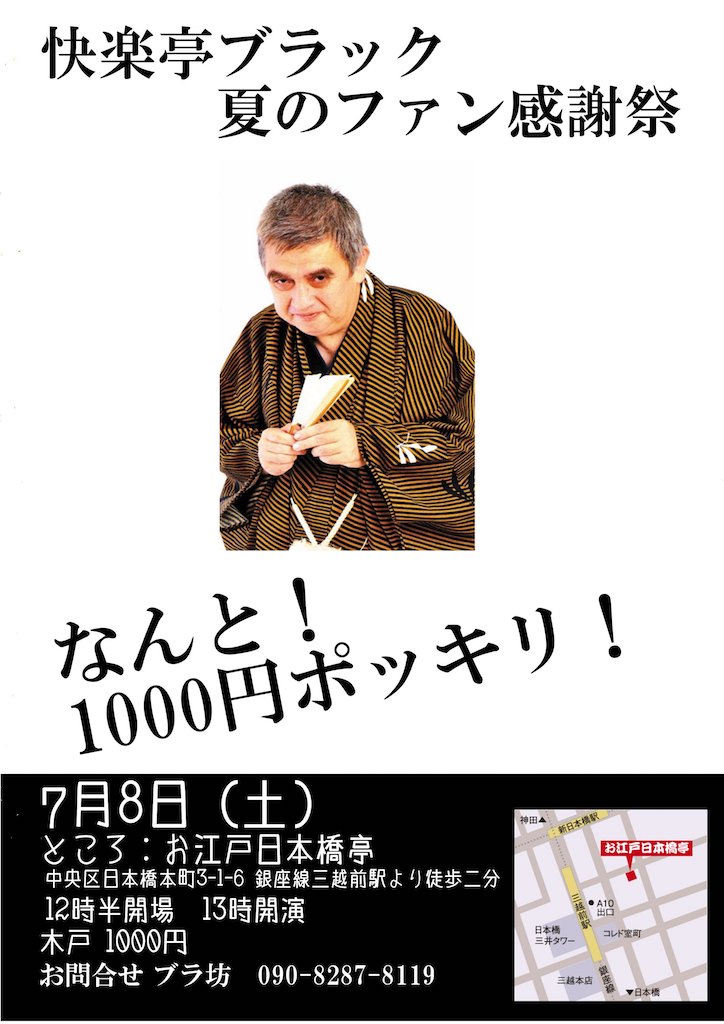 先ずはブラ坊。「夏泥」は何もない長屋に入った泥棒がしょうがなくなり、自分の金を置いてくる噺。ブラ坊は正統的な話ぶりでよどみがない。二つ目。ブラックの唯一の弟子である。