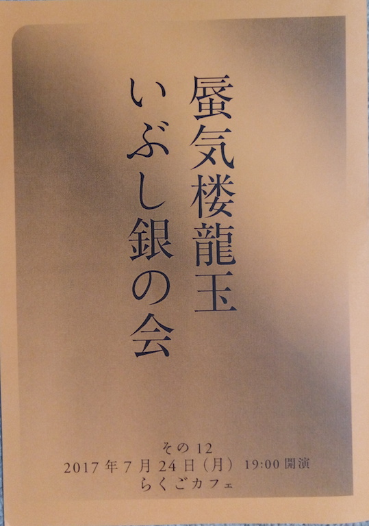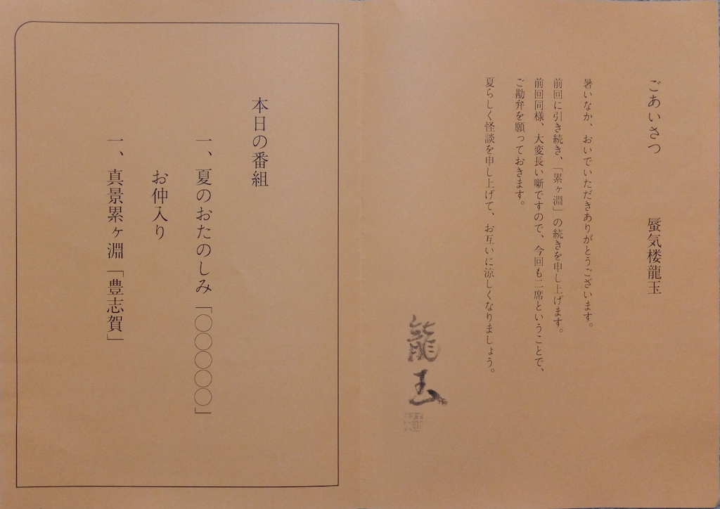 トリは三遊亭圓朝作「真景累ヶ淵」から「豊志賀」。若いツバメを囲った年増女の嫉妬をじっくりと語りこんだ。龍玉の真骨頂だ。