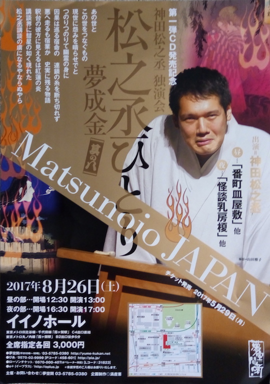 松之丞は相変わらずだらっとした身振りで出てきた。イイノホールでの独演会を二つ目の身分でやらせていただいてと神妙なまくらを振る。そのあとはいつも通り軽妙な話で笑わせる。