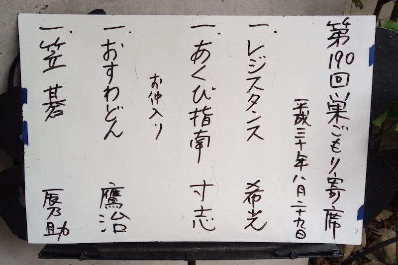 8月は3回目のすがも巣ごもり寄席。客の数は今までで最低の20人弱。目玉になる落語家がいないせいか。