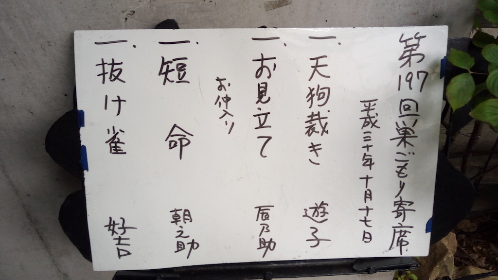 第197回すがも巣ごもり寄席。今にも降り出しそうな天気。そのせいか客の数が今までで一番少なかった。15名。