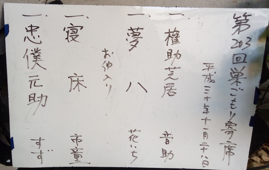 仲入り後は柳亭市童で「寝床」、これも面白い噺だ。市童は汗びっしょりで大熱演。ただ肝心なところで切れ味が悪くなる。トントントンと勢いで押して欲しいところで説明的になる。センスの問題か。