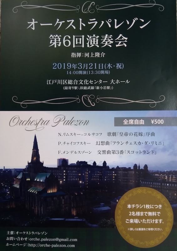 今日の1曲目はリムスキー=コルサコフ作曲の歌劇「皇帝の花嫁」序曲である。音響効果が良いせいか一番後ろの席までよく響く。オーケストラの技量も良い。