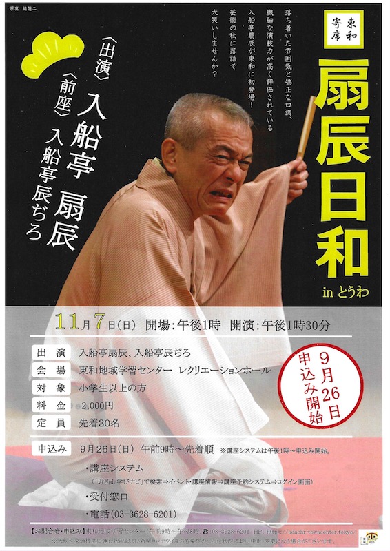 オリンピックが終わる頃、自宅近くの東和地域学習センターで生の落語を演るという記事を目にした。演者は入船亭扇辰師匠である。