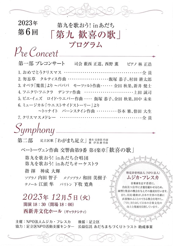 第二部は足立区歌「わがまち足立」のあと、ベートーヴェンの交響曲第九番の第4楽章「歓喜の歌」。コントラバスによる出だしのメロディを聴くといつもワクワクする。今回は最小限のオーケストラで、各パートの楽器が一つか二つしかない。器楽奏者の応募者が少なかったのだろう。