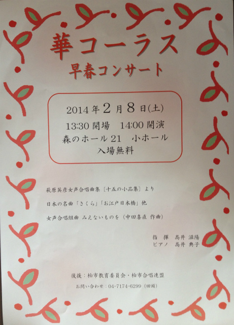 外は吹雪。しかも20年ぶりの大雪だ。コンサート会場の中では華コーラス20名の団員と約100名の観客が素晴らしい歌声に酔っていた。