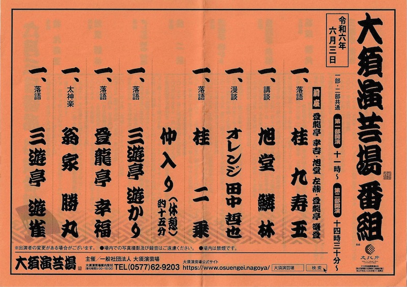 大須演芸場は名古屋の大須観音の裏手にある、中京圏で唯一の寄席である。沿革を見ると、1965年10月1日にストリップ小屋を改造して、落語とコントと漫才を上演する寄席としてオープンした、とある。座席数は1階2階合わせて180席である。新宿末廣亭と上野鈴本演芸場の間くらいの規模である。