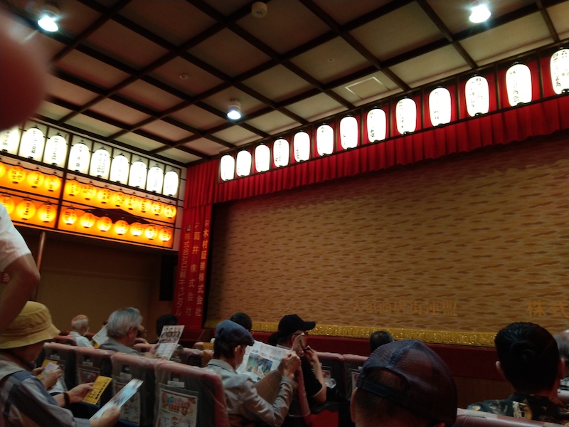 古びた小屋を予想していたが、大違い。会場はきれいだし、座席はゆったりしていて新しい。改装したばかりのようだ。月曜日の午後の会にもかかわらず、客の入りは上々、6、7割の席が埋まっていた。仲入りの時間に場内でみやげ物やTシャツの販売をするなど、客に対してきめ細かなサービスをしていた。どら焼き3個入り800円を購入した。味はもちろん上々。