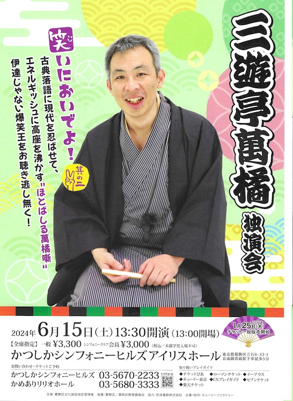 今日の萬橘は長いまくらの後、「千両みかん」に入っていった。まさに今の季節の噺である。今はきゅうりとトマトとナスの季節。萬橘は緑色の手拭いを絞ってきゅうりに見立て、噺をうまく展開していた。