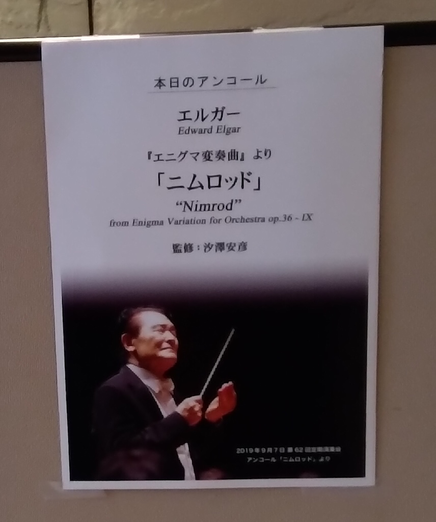 アンコールの「ニムロッド」は過去2018年9月9日、2019年9月7日、2023年3月5日の3回アンコールで演奏した曲である。汐澤氏にとっても、団員たちにとっても思い出深い曲であろう。