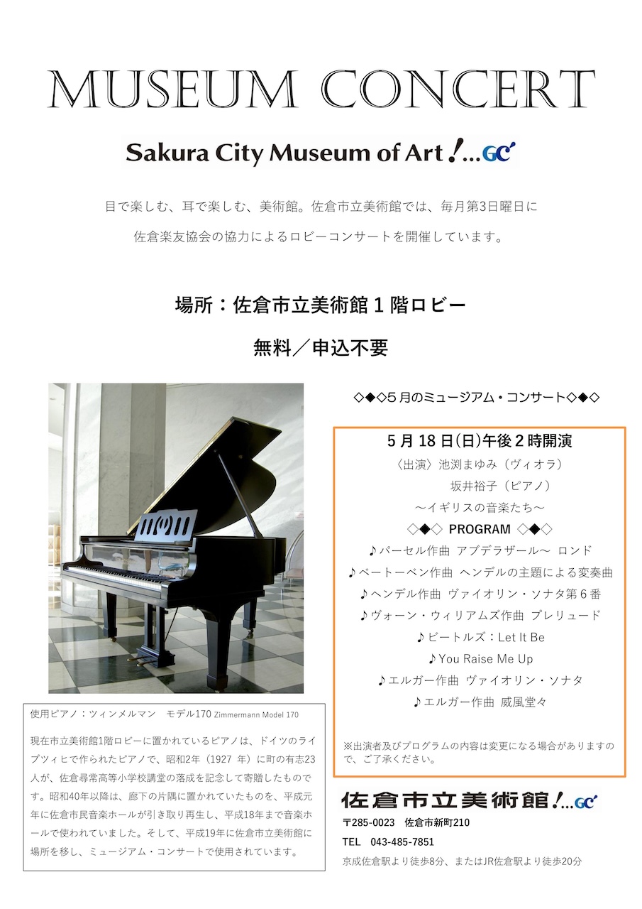 月に一度佐倉市立美術館でコンサートをやっている。15分前に会場に着いたらすでに席は埋まっていた。市民の間に浸透しているようだ。ロビーの半分のスペースは喫茶店になっていてそこの席はまだ空いていた。紅茶を注文してそちらの席に着いた。