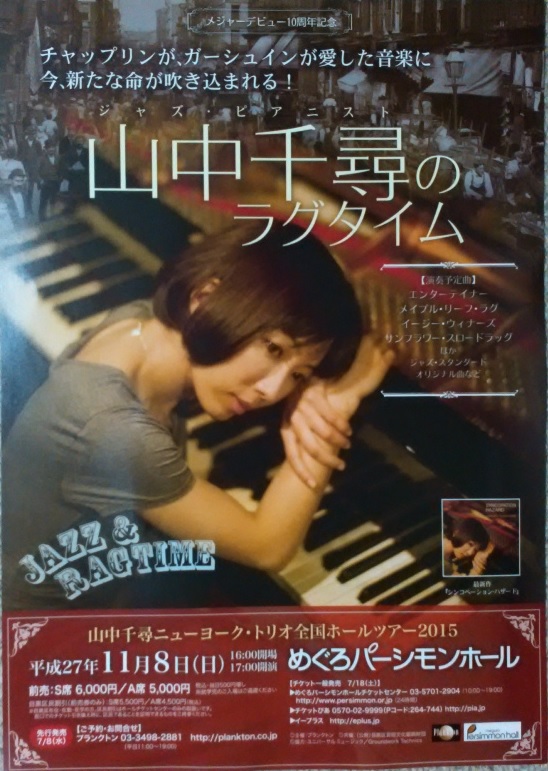 今回の山中千尋のテーマはラグタイムであった。とはいってもラグタイムをそのまま演奏するのではなく、山中流にアレンジしてであるからそれを聴く我々はいつもの力強い山中千尋のピアノに出会うばかりであった。
