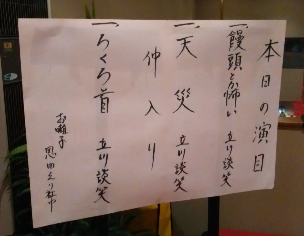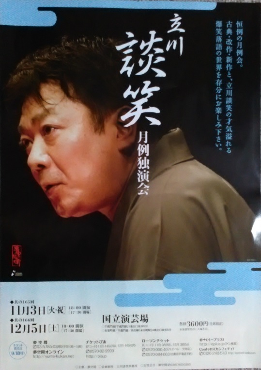 ここまで1時間半、長い前半の後は「ろくろ首」。トリでやるには軽い噺かな、と思ったがここでも本来の噺から逸脱する。談笑は古典落語を普通には演らない。ろくろ首に遭って逃げ帰った与太郎に大家さんがおっかさんが首を長ーくして待ってたよというと、うちにもろくろ首がいた、といって落ちになるという本来の噺にはならない。新婚初夜に新郎に逃げられた新妻がかわいそうでならない、と談笑はいう。それではどうなればいいのか。こうではないかというのが談笑の考えで、実に人間的な落ちになる。そこには若い女の子の犠牲の上に成り立つような噺は演らないという談笑の決意が感じられた。