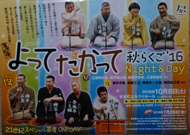 トリは柳家三三の「三枚起請」。トリにかけるだけに大ネタだ。この長い噺を立て板に水、しかもメリハリがあって聴きやすい。「うまい」っと掛け声をかけたくなった。三人の間夫たちに責められる花魁喜瀬川が開き直って逆襲するところは上司にいびられる世のOLたちは胸がすく思いだったろう。