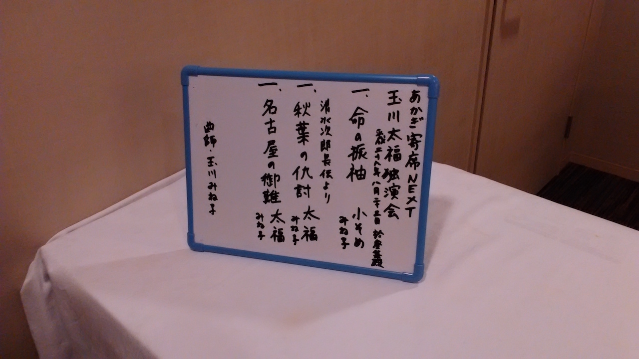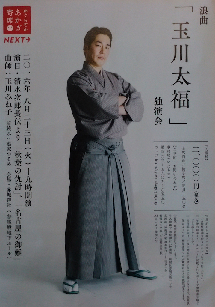 本日の演目は清水次郎長伝より「稲葉の仇討」と「名古屋の御難」である。「稲葉の仇討」で太福は吠えまくった。悪逆非道な武居安五郎を甥の仙右衛門に討たせてやろうとする次郎長の活躍だ。正義感に溢れる次郎長に扮する太福は吠える吠える。そして唸る。その目はまるで次郎長が乗り移ったかのようだ。こちらを睨んだときは怖かった。