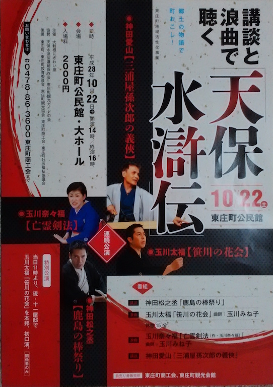 講談、浪曲で有名な天保水滸伝を現地で聴こうという贅沢な会である。少し早めに到着し、街を探索した。特に観るべきものもなく閑散とした街と稲刈りが終わったばかりの田んぼがあるばかりだった。旅の巻を参照してください。 歩き回った後公民館へ行ったら席は三分の一くらい埋まっていた。いつもの舞台とは違い独特の雰囲気なのはほとんど街の人だからだろう。会場全体がわーんと聞こえるほどおしゃべりしている。最終的に満席の350人入ったうち東京方面から来た人は1割くらいであったろう。10人くらいが電車で帰り、10人くらいが旅館に泊まったようだ。 まずは神田松之丞の「鹿島の棒祭り」からスタートだ。松之丞のジョークがまるで通じない。この人は何をやるんだろうという感じで観察されている。ヤケ気味に話を語り始めた。語り始めたらそれなりに面白いので笑いも来ていたし、拍手もきていた。それでも松之丞は納得できないという感じで下がっていった。 今日の観客は義理で集められた人達かなと思った。間違いだった。玉川太福が登場した途端数人の掛け声とともに大拍手だ。まだ始まっていないのに大盛り上がりだ。気を良くした太福は朗々と「笹川の花会」を唸った。曲師玉川みね子の三味線も気持ちが良いほど決まる。うなり声の合間合間に拍手と掛け声が入る。ベテランの観客だったのだ。 休憩後は東庄町の観光大使を務める玉川奈々福。スカイブルーの着物姿で華やかに登場する。女性の浪曲師は登場するだけで華やかだ。掛け声と拍手は太福に負けず劣らず鳴り響く。今日の演目は自作の「亡霊剣法」だ。自作とはいっても天保水滸伝の中の話だ。どうやら天保水滸伝というのは物語の宝庫のようだ。 トリは神田愛山の「三浦屋孫次郎の義侠」。ここで笹川繁蔵は殺されてしまう。愛山師匠は淡々と読んでいく。ハリセンも初めにバシッと叩いたほかはほとんど使わない。松之丞はリズムを刻むように小刻みに叩きっぱなしだ。人によってずいぶん違うようだ。さっきまで掛け声やら拍手やらで賑やかだった会場はしんとして愛山師匠の話に聴き入っている。東庄町の人々は講談と浪曲を聴き慣れているようだ。さすがは天保水滸伝の故郷である。観客の中には笹川重蔵の子孫の方々もいたらしい。