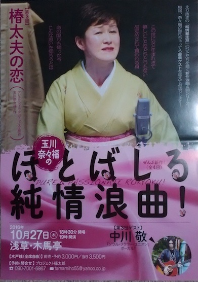 次は今日の公演のプロデューサー玉川奈々福が呼んだ特別ゲスト、中川敬の公演だ。浪曲の小屋でロックの歌手が出るのは珍しいのではないか。PAがそのままでは嫌だな、と思っていたらそのままのセッティングで始まった。ギターの音が異常に大きい。マイクに口をつけるようにして歌うから歌詞もはっきり聞こえてこない。コンサート会場ではないのだからもっと自然な音響で聴きたかった。残念ながら歌を楽しむどころではなく、苦痛をこらえるのに必死だった。