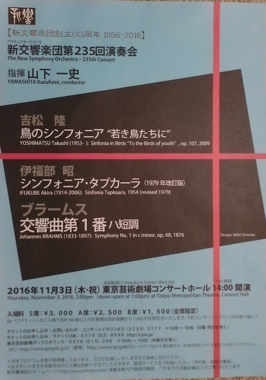 吉松隆作曲の「鳥のシンフォニア "若き鳥たちに"」はよく聴いていなかった。客席に作曲者が来ていて曲が終わった時に舞台に呼び上げられて挨拶をしていた。