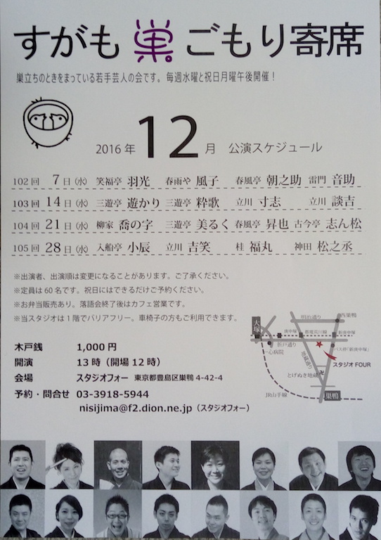 商店街が切れるあたりに今日の目的地スタジオフォーがある。ここはジャズのライブ演奏と落語をやるスタジオだ。落語は主に二つ目主体でやっている。巣ごもり寄席のパンフレットには「巣立ちのときをまっている若手芸人の会です」と書いてある。