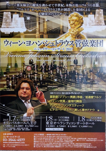 オーストリアのウィーンから来た管弦楽団は1月3日の横浜公演から1月13日の長野公演まで日本で演奏会を開く。東京ではここ八王子を皮切りに初台の東京オペラシティで2公演合計3回演奏会を行う。今日は東京での初日、出て来たときの楽団員は緊張の面持ちである。最後に指揮者が登場すると拍手が一段と大きくなる。指揮者のヨハネス・ヴィルトナーは元ウィーン・フィルのヴァイオリン奏者である。太っていてたいこ腹、オペラに出てくる父親役のような感じの人である。