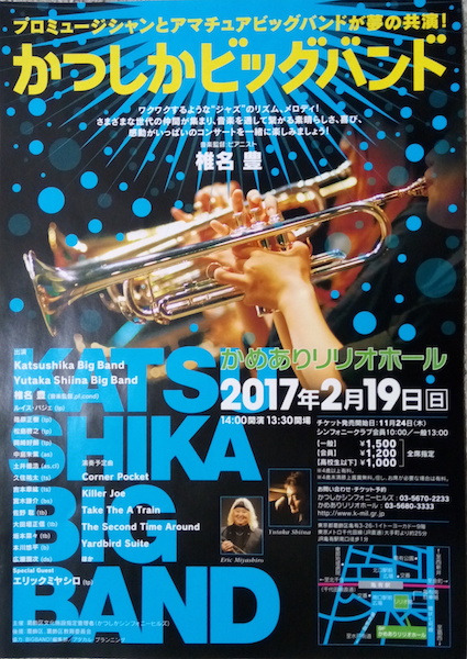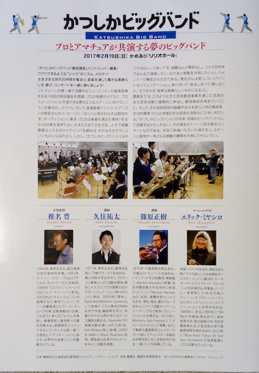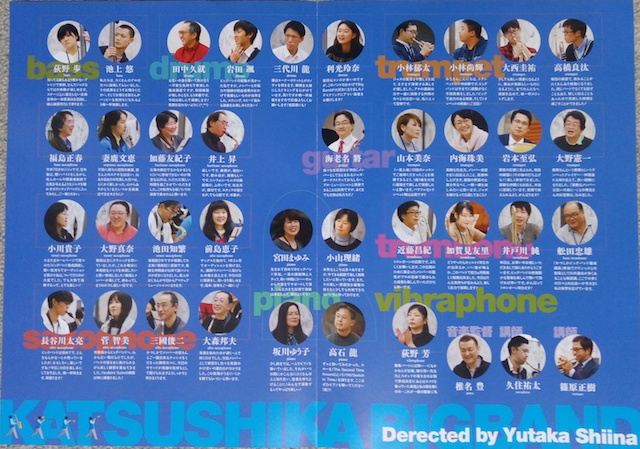 後半アマチュアで編成されたかつしかビッグバンドが登場した。前半出たプロのミュージシャンも混じるから大編成のビッグバンドである。リズムセクションは同じパートに3人くらいずつ待機しているから入れ替わり立ち替わりの登場になる。