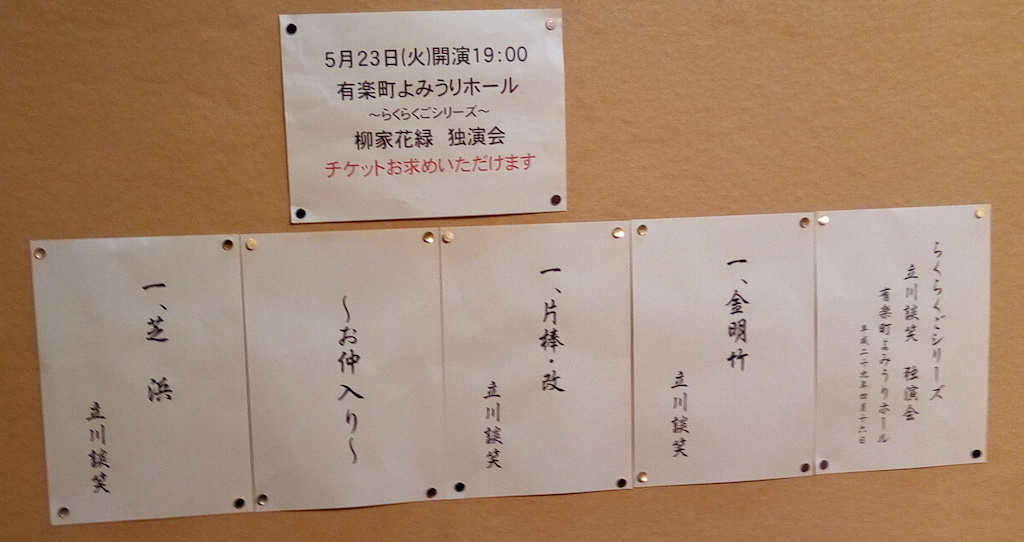 桜の花も散り始め、夏のような天気になった。外を歩くには半袖で十分な陽気。今日はよみうりホールでの談笑独演会だ。日曜日の昼下がり、世間の人は最後の花見か、インドアのホールは空席が目立った。