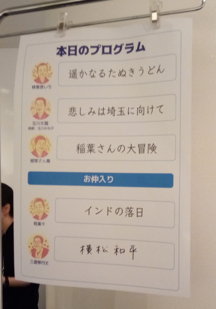 次は浪曲、玉川太福の「悲しみは埼玉に向けて」。北千住で東武線に乗り換えて埼玉県あるいは群馬県栃木県まで帰ろうという通勤のサラリーマンを皮肉った噺、円丈自身が北千住在住ということもあってところどころ話がリアルになる。そこが妙におかしい。演者太福と曲師みね子のコンビはますますチームワークが良くなっており、このような新作の話でも楽々と三味線の合いの手を入れている。