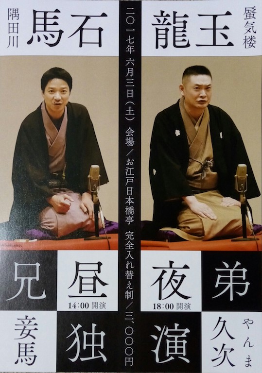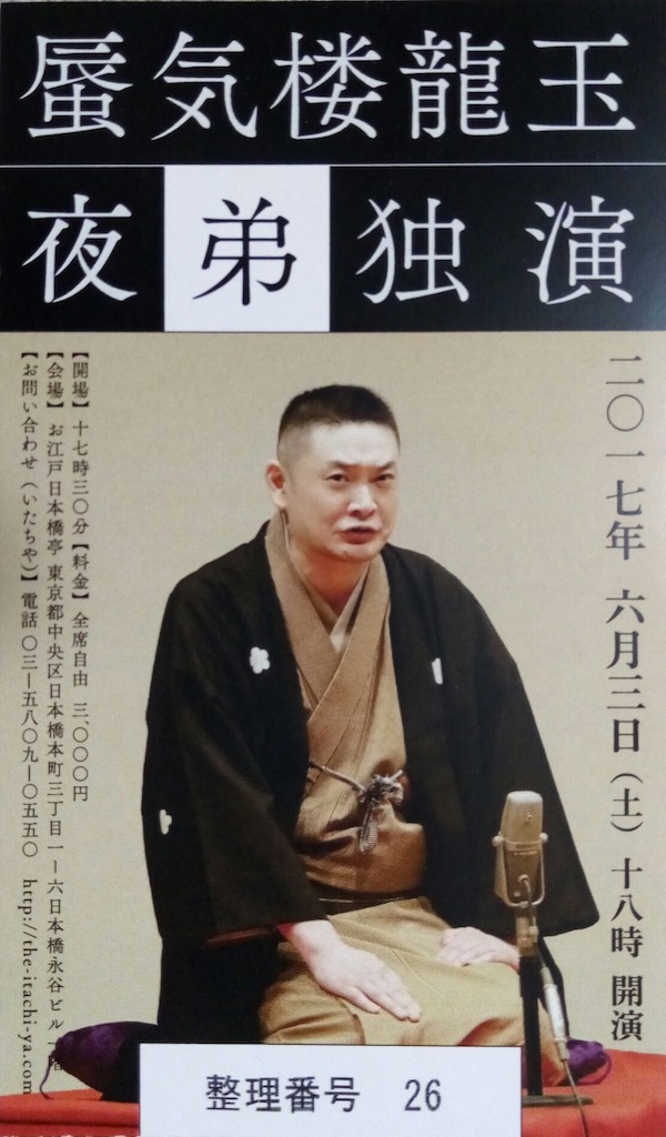 隅田川馬石、蜃気楼龍玉兄弟独演と銘された会の弟の会はお江戸日本橋亭の夜席に行われた。初めて聴く龍玉はどんな落語家なんだろう。