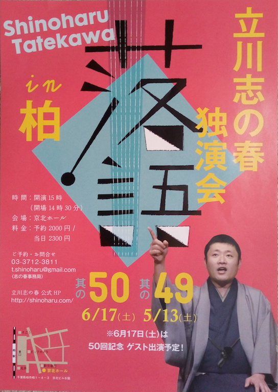 ここ柏市は立川志の春の地元でもある。今日はこの会場でやる50回目の記念日である。ゲストは師匠志の輔の一番弟子、晴の輔。
