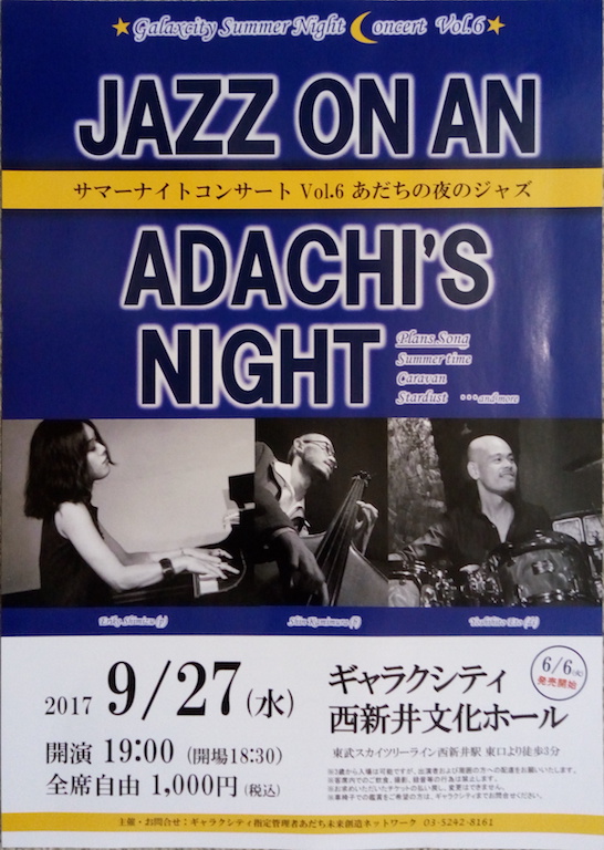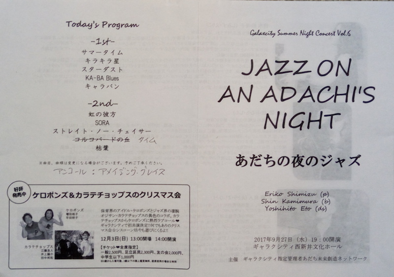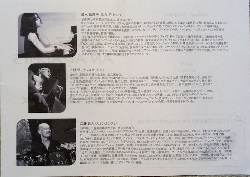 ベーシスト上村信のオリジナル曲「Time」はゆったりしたフォー・ビートで演奏された。 最後はモダンジャズの定番「枯葉」。独特の編曲で「枯葉」とわかるまで時間がかかった。ピアノの音が素晴らしくよく響く。 アンコールは初めて聴く曲のように聞こえるほど変わった編曲の「アメージング・グレイス」。ピアノの音がよく響く。