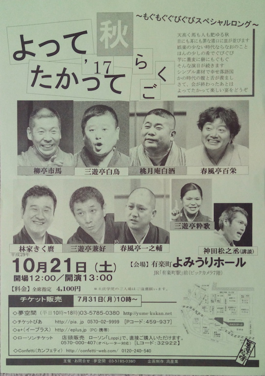 外は降り続く雨。3時間の落語の世界から地上に舞い降りた観客の群れは三々五々有楽町の街へ紛れ込んで行った。