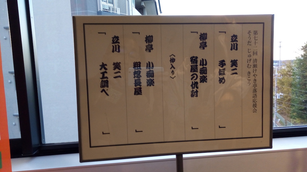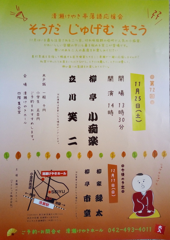 西武池袋線清瀬駅近くの清瀬けやきホールの中に畳敷きの会議室がある。今日の落語会の会場である。畳敷きだから靴を脱いで上がる。それだけで何かアットホームな気がする。