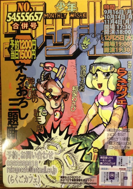 目の前で噺家が演じるのを観て前売り1,200円というのは安い。わさびもそのうち真打になって前売り2,000円になってしまうのだろうが。それでもこの環境で落語が聴けるというのは贅沢なことである。