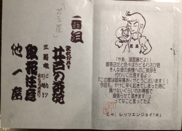 開場の10分前に着いた。客が誰もいないのでオヤっと思った。自分が先頭というのは居心地が悪いものだ。少ししたら誰か来たのでホッとしたら中へ入っていった。あれ、わさびだ。普通のかっこしているからわからなかった。