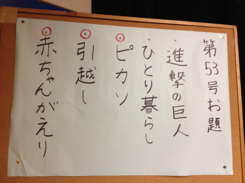 中入りに次回の三題噺の抽選をやった。観客が書いたお題をわさびが無作為に選ぶ。選んだ5枚の中から観客の拍手で3枚にしぼる。