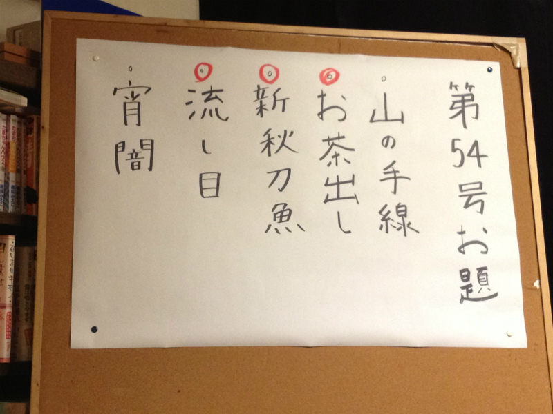 今回選ばれたのは"お茶出し" "新秋刀魚" "流し目"の三題だ。次回の9月16日までに作らなければならない。これを53回やっているのだからたいしたものだ。