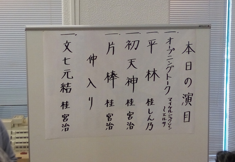 開口一番は桂しん乃。独特の舌足らずの口調でやった噺は「平林」。観客爆笑。前座の割にはバカに面白い。