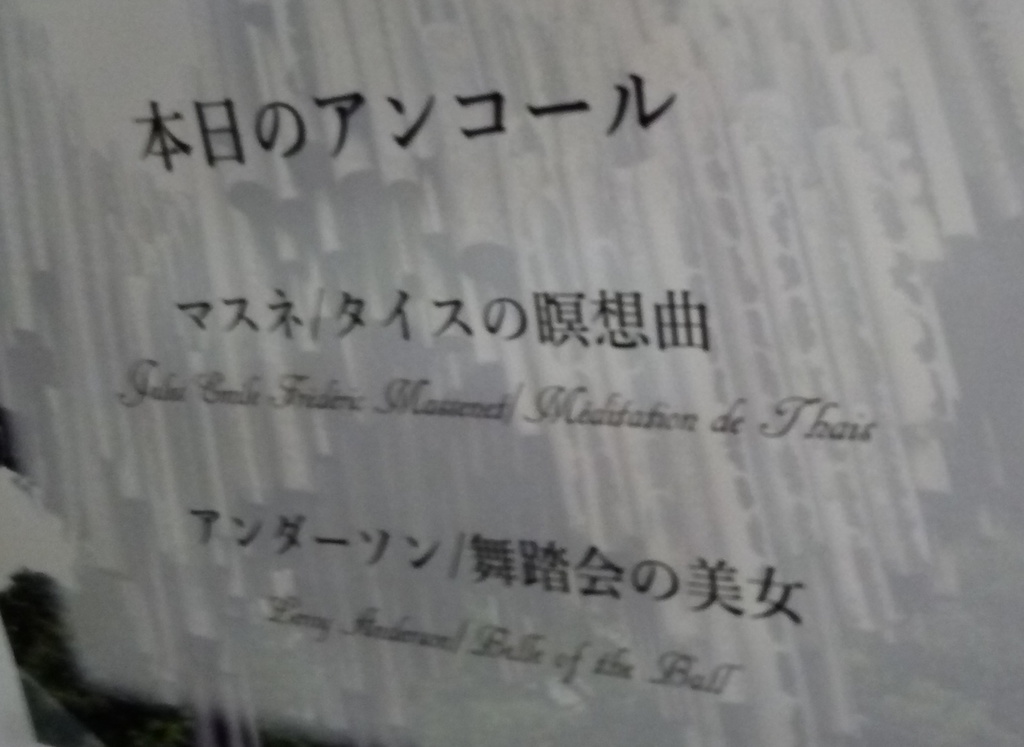 アンコールは2曲、「タイスの瞑想曲」と「舞踏会の美女」である。興奮した観客の気持ちをクールダウンするかのような優しげな、そして優雅な曲で今日のコンサートはお開きになった。