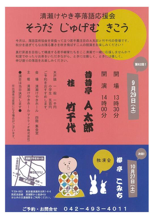 台風24号の影響で雨。会場が清瀬市の施設なので外で待たなくてもいいのがありがたい。ばかりか先着14,5名は椅子に座って待つことができる。