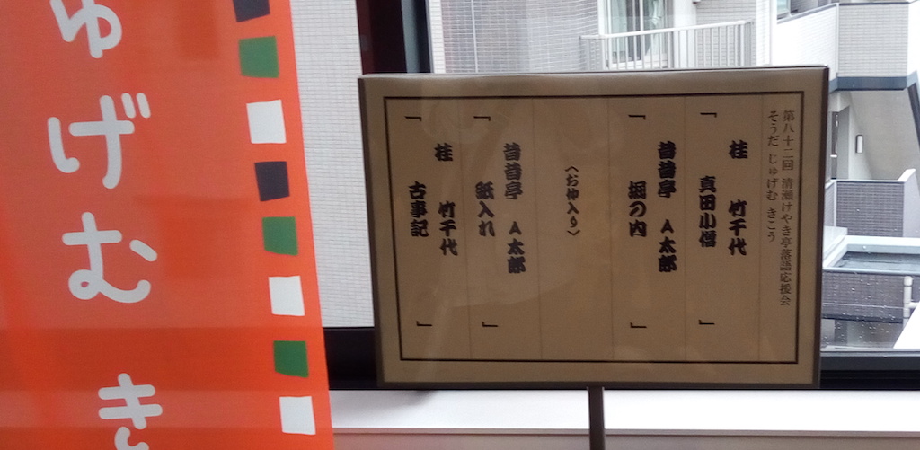 仲入り後は再びA太郎。噺は「紙入れ」。間男の新吉と引っ張り込んだ親方の女房。帰らないはずの旦那が帰ってきた。あわてる新吉とあわてない女房。聴きどころ、語りどころのところをA太郎はあっさりと流してしまう。新吉のあわてぶりが伝わってこない。全体的にあっさりした「紙入れ」であった。