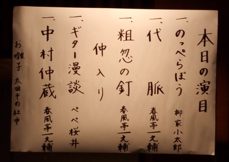 中入り後はギター漫談のぺぺ桜井。ぼそぼそした口調でギターと一緒に喋る。大ベテランの83才。ギターの音色がいい。これぞ芸人という雰囲気を身につけている。