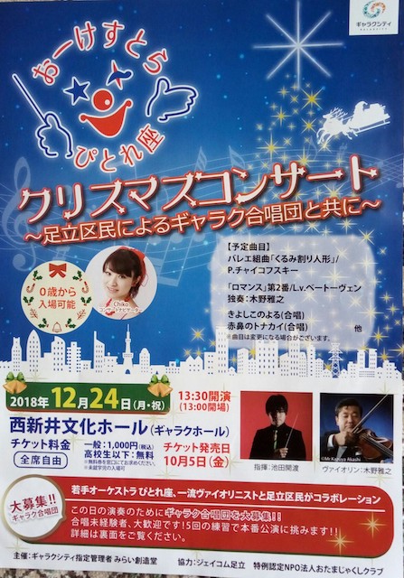 第3部は足立区民約50名による演奏。「赤鼻のトナカイ」「きよしこの夜」ジョン・レノン作曲の「ハッピークリスマス」を歌った。クリスマスイブらしい楽しい演奏会であった。