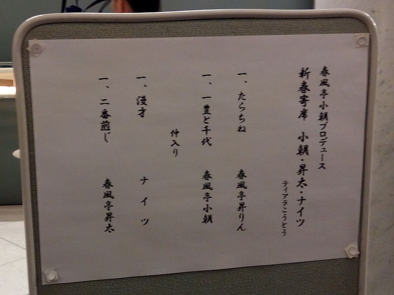 トリは昇太で「二番煎じ」、「禁酒番屋」と似た噺で初めはどちらかなと思った。昇太は独演会の時のキレはなく、乗りにくい感じだった。乗ろう乗ろうとしているうちにまくらが冗長になってしまい、観客のほとんどが「早く始めないかなー」という雰囲気になったところで本題が始まった。