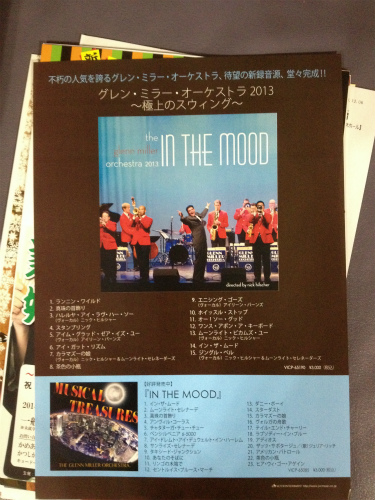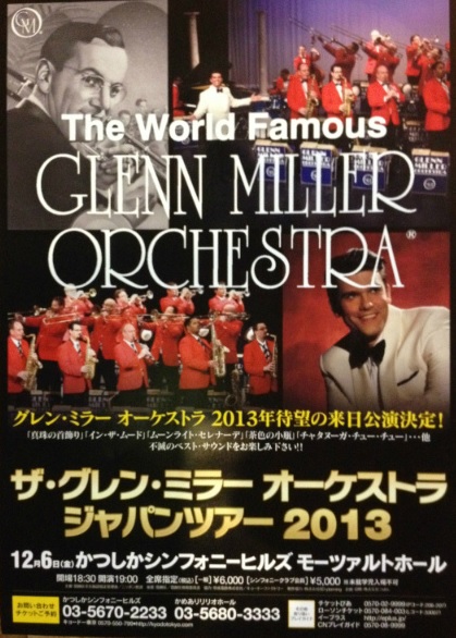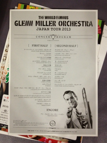 よく知った曲をおなじみのアレンジで聴くのもいいものだ。 グレン・ミラー楽団は毎年のように来日している。今回の指揮者は以前とは代替わりしていた。ニック・ヒルシャー、元この楽団の歌手だったらしい。 そのせいか楽曲も歌ものが多く、指揮をしながら歌いまくった。顔立ちもハンサムで若いころのシナトラのようだった。 会場のモーツァルトホールは音響効果がよく、収納人員も1,300名と中規模のホールである。このくらいの大きさが出演者の表情や動作がよくわかり音楽を聴くのには適していると思う。
