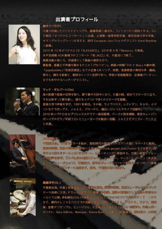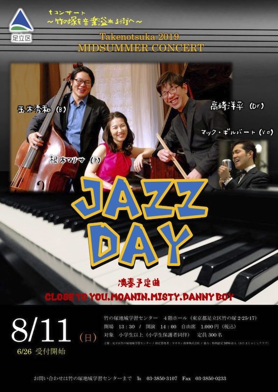 次の「Moanin'」はアート・ブレイキーで有名な曲。マック・ギルバートと根木マリサの掛け合いが絶好調。ピアノの唸るような低音部の迫力が曲の心をみごとに表現していた。