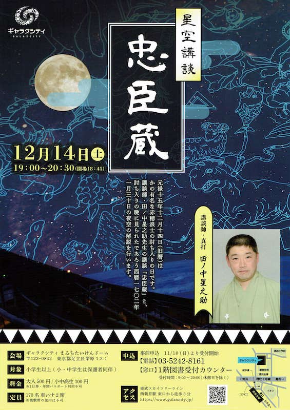 講談の出し物は忠臣蔵、プラネタリウム部門は専門の学芸員が解説する。
