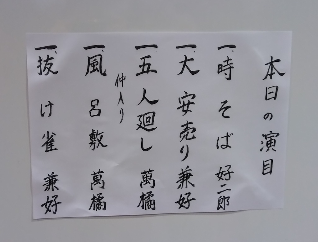 江戸時代から続いている古典落語は同じ筋の話を各時代のさまざまな落語家たちが伝えてきた。初めて聴く分には面白いが、同じ話を何度も聴くと飽きがくる。優れた落語家は客に先読みを許さない。そこに演者と客の緊張感が生まれる。今日の落語会は最後までこの緊張感が切れることがなかった。